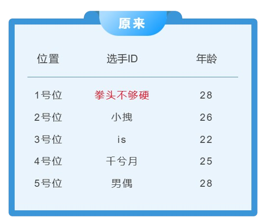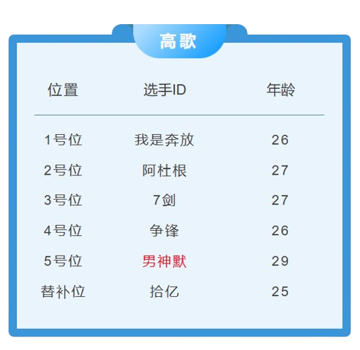 新增队员:【1号位】我是奔放 ,【3号位】7剑 ,【4号位】争锋 ,【5号位】男神默