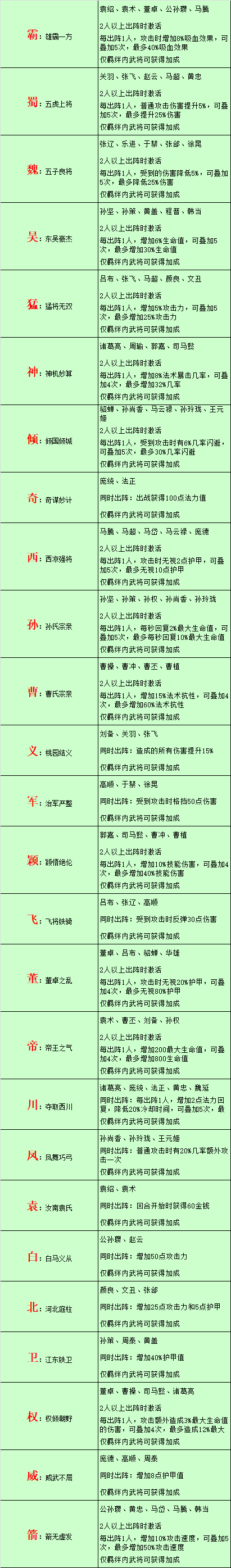 羁绊:蜀:五虎上将 猛:猛将无双 西:西凉强将