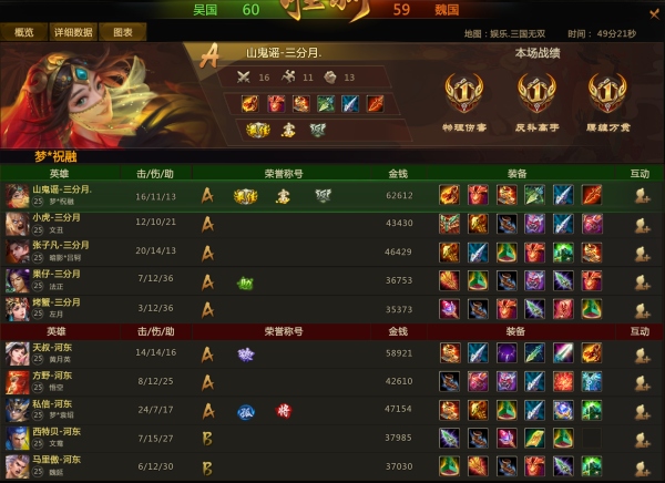 32分钟,双方在魏国BOSS处遭遇,在拉扯中魏国梦*袁绍细腻操作连斩吴国梦*祝融、文丑二人,帮助己方成功夺得BOSS上古炎魔,黄月英获得炎魔之焰与上古号角。36分钟,魏国众人在中路抓住机会集火击杀吴国左月、文丑、梦*祝融三人。此时双方比分52:53,魏国成功反超比分。38分钟,双方再次在中路爆发团战,吴国梦*祝融在战败后买活赶往战场成功地挡住了魏国的强力攻势,此时双方比分56:57。47分钟,双方再度在中路爆发团战,吴国左月在拉扯中大招成功收割残血文鸯,帮助己方率先拿到60击杀。吴国三分月取得本场比赛胜利!